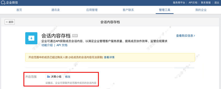 不過小編要提醒大家,我們試用或直接付費(fèi)購買企業(yè)微信會(huì)話存檔功能后,還不能直接用來保存員工和客戶的聊天記錄,我們需要進(jìn)行二次開發(fā)才能使用。