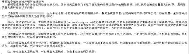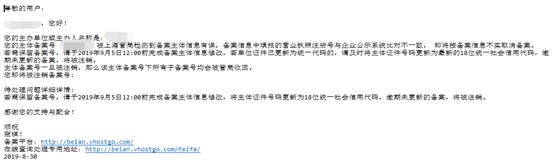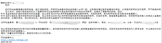 由于郵件、短信等通知的到達率、閱讀率的問題,我司不承諾在清理之前都會通知到相關用戶,但我們會盡我們最大的努力來發送相關通知,一般會在取消接入前幾天發送郵件、短信、微信(如果有關注公眾號?關注備案公眾號)。我們不提供我們發送過相關通知的“證據”和“日志”。所有備案用戶有義務保障自己備案資料的正確性,通信方式的準確性,以及應該在備案負責人變更后及時更新為最新的聯系人(主要是相關人員離職的情況下)。