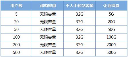 1、用戶數、郵箱容量,個人中轉站容量和企業網盤容量不同