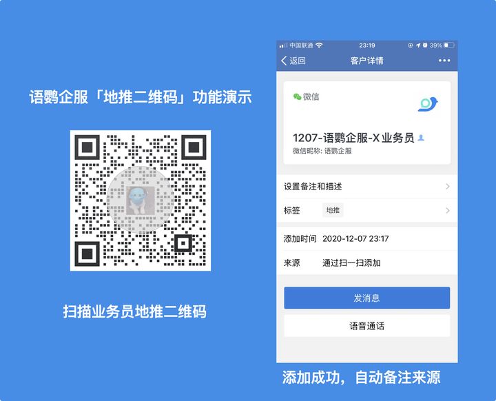 這就要用到語鸚企服私域管家的渠道活碼了。如圖所示,客戶通過掃描業務員地推二維碼加到客服,客服就能夠清楚的知道客戶是哪個業務員帶來的。管理員也可以根據地推效果給予業務員一定的提成獎勵。