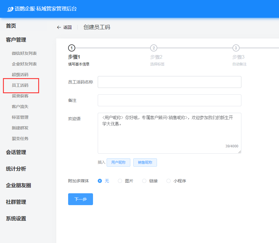 登錄語鸚企服管理后臺,通過員工活碼功能模塊即可創建地推二維碼。這里為了方便查看,你可以將活碼名稱設置為業務員名稱,然后配置添加后自動發送的歡迎語,歡迎語可以添加文字、圖片、鏈接、甚至是小程序。