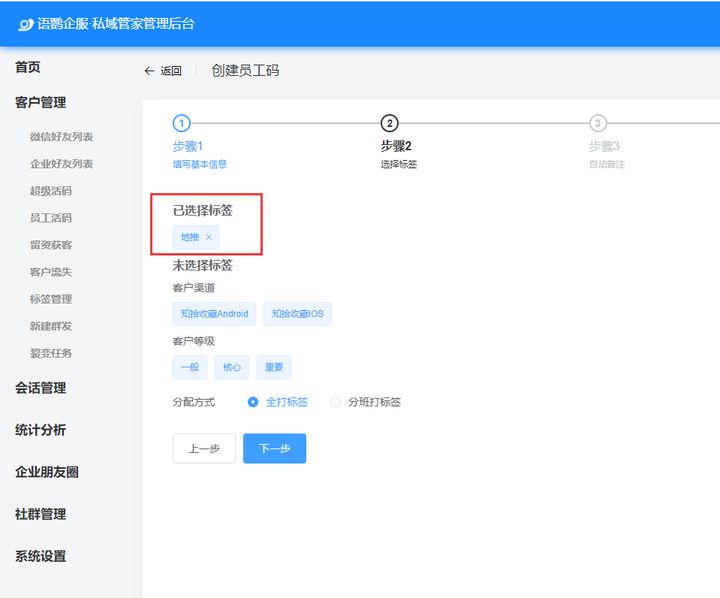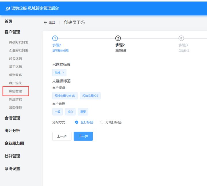 通過標簽管理創建一個“地推”的標簽,然后選擇該標簽,這樣掃碼添加的客戶都會自動打上“地推”標簽,更加清晰的知道客戶是通過地推加過來的。