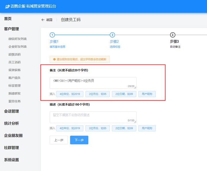 如果我們想清晰的知道是哪個業務員添加的客戶,在備注那里可以設置為:日期-用戶昵稱-業務員名字,這樣客戶加過來,就可以直接在客戶昵稱上看到他是哪個業務員邀請過來的,從而進行統計每個業務員拉客戶的數量。