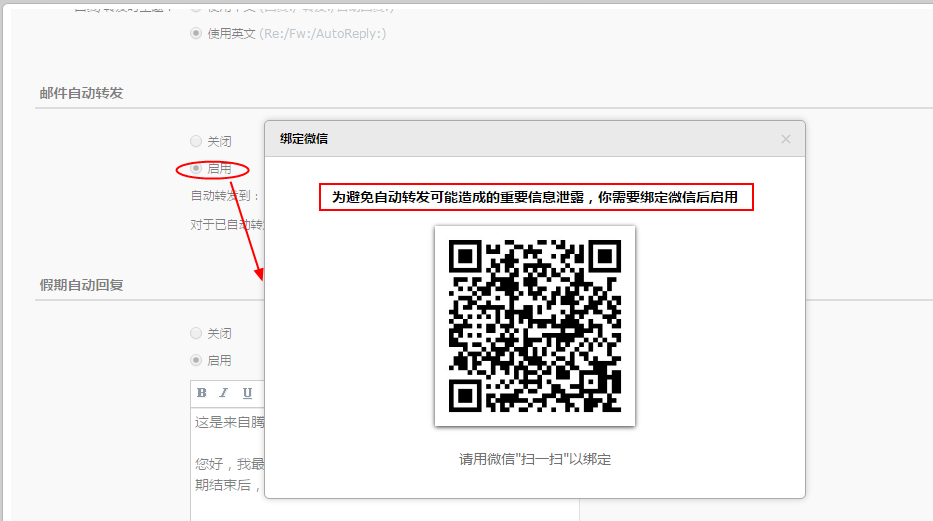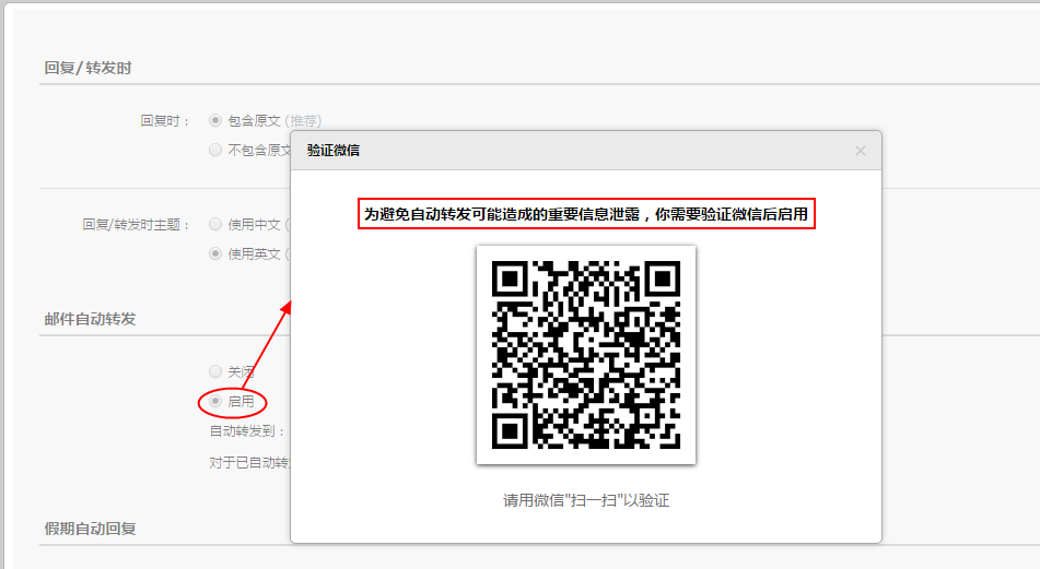 一、在郵箱設置或創建收信規則時, 如果啟用“自動轉發”功能,需要進行微信二次驗證。