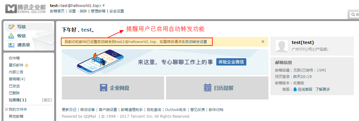 1.?成員郵箱首頁會有黃條提醒用戶已啟用自動轉發功能,如下圖: