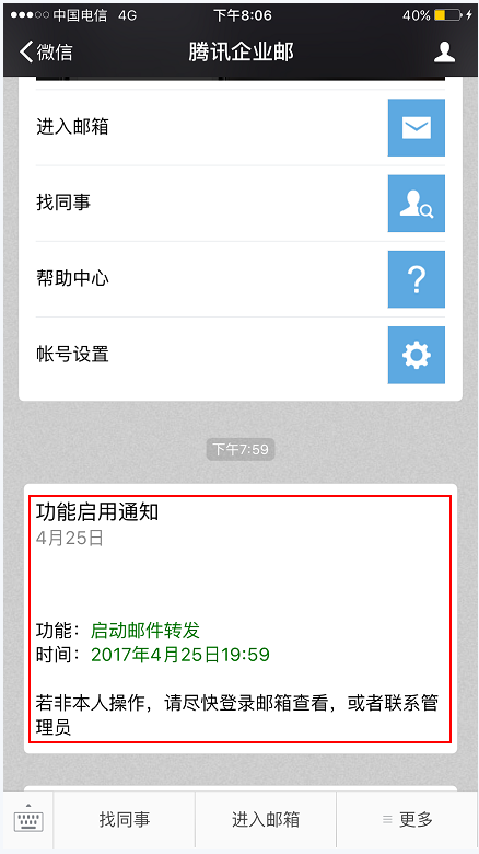 3.成員綁定的微信會收到已啟用自動轉發功能的提醒消息,如下圖: